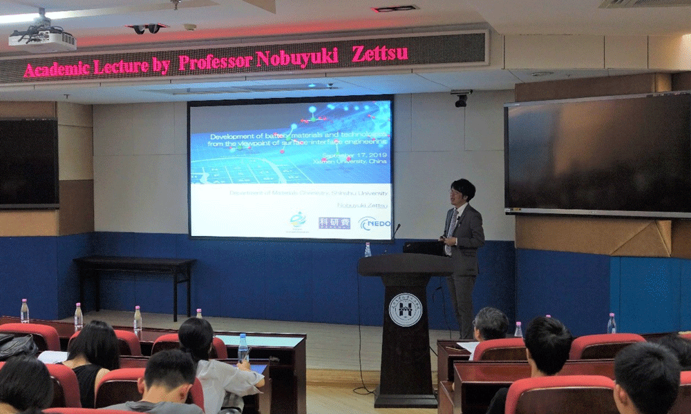 当天下午,是津教授应邀到厦门大学化学化工学院做学术讲座,在卢嘉锡楼202报告厅开展了题为“Surface engineering and supramolecular assemblies of active materials for advanced lithium ion batteries”的学术报告,由赵金保教授主持。讲座刚开始时,是津教授向大家介绍了他所在的城市及课题组的简要情况。报告主要围绕平面控制材料生长(熔融盐再结晶)、活性材料表面改性、基于碳纳米管的超分子组装电极(无粘结剂电极)等几个方面展开介绍了是津教授研究团队在正极材料的相关工作进展。报告厅内座无虚席,讲座现场气氛活跃,相信是津教授的精彩讲座一定会给老师和同学们的课题研究带来启发和新思路。