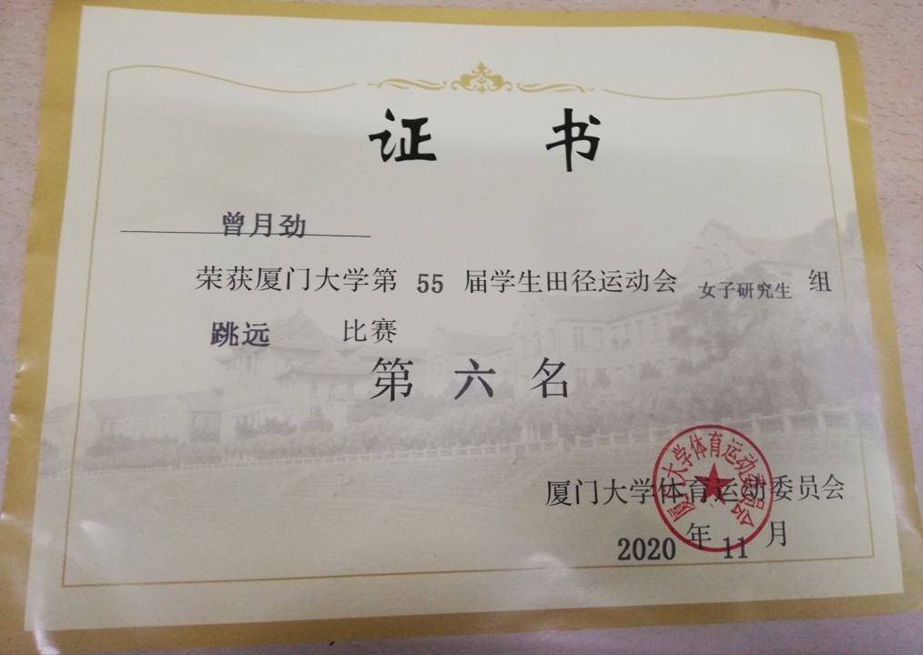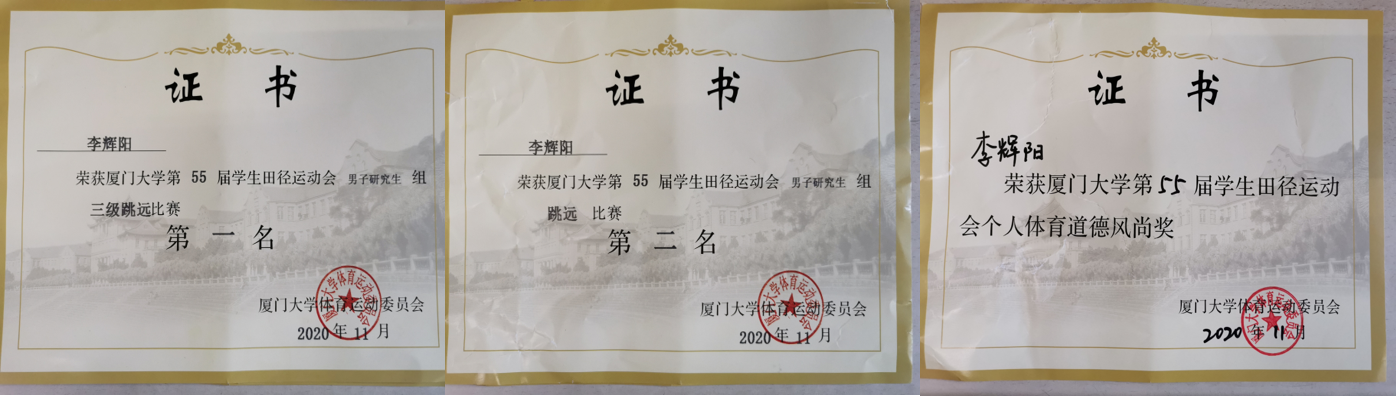 厦门大学第55届学生田径运动会于11月6日拉开帷幕。赛场上触摸到跳动的青春音符,感受到青春的活力。经过两天的激烈角逐, zhaolab实验室的李辉阳同学和曾月劲同学赛出实力,展示风采,取得了优异成绩。