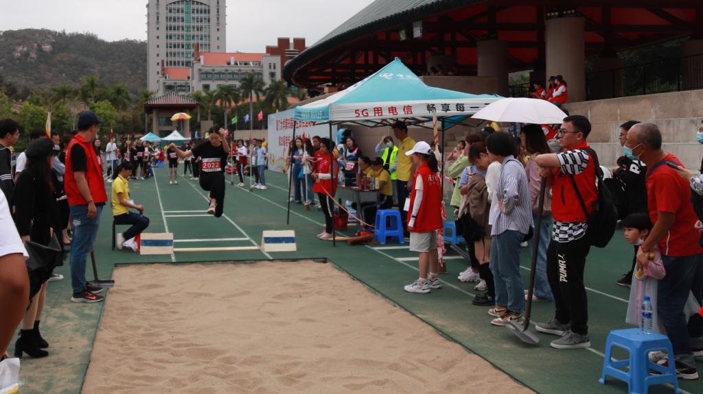 曾月劲同学英姿飒爽,助跑后纵身一跃,划出一条美丽的弧线,完美落地,夺得女子研究生组跳远比赛第六名。