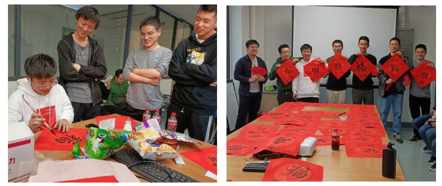 “写福”活动结束后,由研一的同学负责贴福。经过一下午的努力,干净喜庆的实验室俨然已经做好了迎接新年的准备了。最后,祝课题组的全体师生们新年快乐,心想事成!