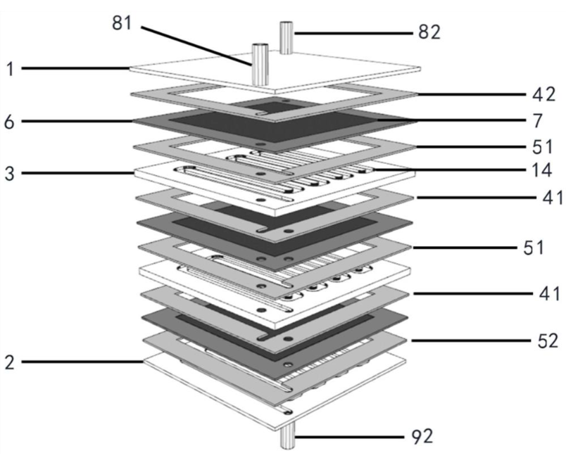 摘要:本发明一种蛇形气道平板式固体氧化物燃料电池电堆,包括括上集流板、下集流板和设置在所述上集流板和下集流板之间的堆叠结构;所述堆叠结构包括至少两个双极板、设置在所述双极板与集流板之间的电池片和密封件;所述双极板具有阳极气道和阴极气道,在所述双极板的阳极气道侧有第一阳极气体密封件,在所述双极板的阴极气道侧有第一阴极气体密封件;所述电池片包括单电池和单电池框架;在所述电堆上分别设置有氧化气体和燃料气体的进气通道和出气通道。本发明有利于促进冷热流体间的热交换,降低冷流体入口端和热流体出口端的温度,同时有利于提高燃料气体和氧化气体的利用率,有利于促进燃料气体和氧化气体在所述电池片中的扩散。