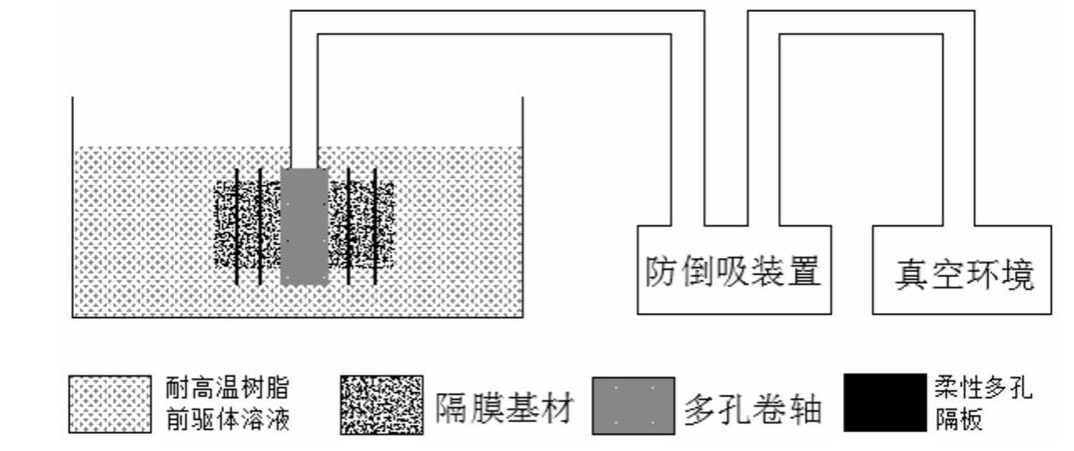 本发明公开了一种耐高温改性隔膜及其制 备方法,包括如下步骤:1)将耐高温树脂、固化 剂、固化促进剂和溶剂混合均匀,制备耐高温树 脂前驱体溶液;2)将收卷态的隔膜基材静置于盛 有耐高温树脂前驱体溶液的浸置槽内,抽真空静 置;3)将静止后的收卷态隔膜破真空取出,干燥 固化得到耐高温改性隔膜。本发明制备的耐高温 改性隔膜,包括多孔的隔膜基材和立体耐高温聚 合物支撑层,所述立体耐高温聚合物支撑层覆盖 于隔膜基材的表面和内部孔隙中,能够有效解决 改性前驱体溶液对隔膜浸润性不良的问题,提高 隔膜的耐热性,保障电池的安全性能。