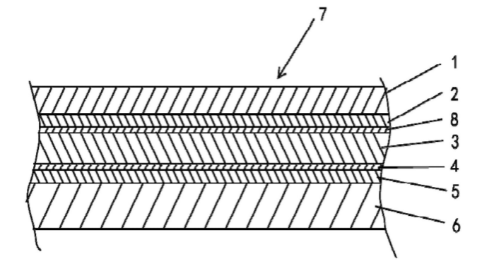 1-(绝缘)基材层、2-第一粘接层、3-中间层、4-阳极氧化层、5-第二粘接层、6-热熔性树脂层、7-铝塑膜