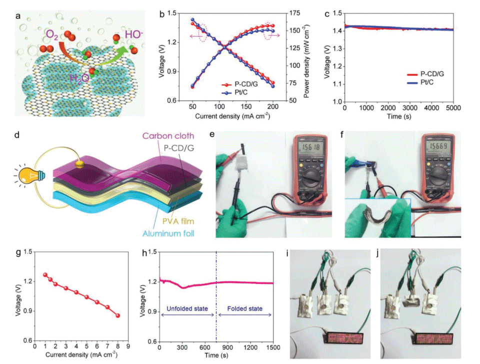 随着人们对可穿戴便携设备的日益需求吗,柔性储能设备的发展成为了目前炙手可热的研究方向。而全固态金属空气电池由于具有8100 Wh kg-1的理论能量密度,被认为是具有前途的清洁能源转化装置之一。已用于商业化的Pt/C电极由于其具有贵金属,价格昂贵,耐久性差等劣势,使得阻碍了其商业化的发展。而在碳材料中掺入杂原子可以形成丰富的活性位点,形成具有高效ORR的材料。近日,中南大学冶金与环境学院赖延清教授课题组联合华中科技大学材料科学与工程学院李渊教授,美国西北大学Vinayak P. Dravid教授共同报道了以生物质衍生物为P源,通过掺杂碳点修饰在石墨烯基地上,该材料表现出优异的ORR性能,可与商业化的Pt/C电极媲美。