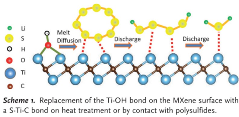 Mxene 是由美国Drexel尔大学的Yury Gogotsi教授和Michel W. Barsoum教授等人在2011年合作发现的一种新型二维结构材料。这类二维过渡金属碳化物或氮化物,结构与石墨烯类似。Nazar 组首次将这类材料作为固硫材料,应用于锂硫电池中,该成果以“Sulfur Cathodes Based on Conductive MXene Nanosheets for High-Performance Lithium–Sulfur Batteries”为题发表在《德国应用化学》上(Angewandte Chemie International Edition 54.13 (2015): 3907-3911)。