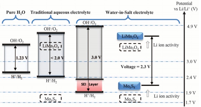 该项工作报道了锂盐(LiTFSI,双三氟甲烷磺酰亚胺锂)与水溶剂混合,制备出水系锂电池用高浓度(>5 mol/L)电解液。随着浓度的升高,水的分解电压窗口变宽。当浓度升高至21 mol/L以后,电化学窗口可达到3.0 V。电化学窗口升高的原因是,当锂盐浓度较高时,阴离子TFSI-先于水分解反应而被还原成LiF等物种,该SEI层在负极表面起到了很好的保护作用。作者使用了LiMn2O4作为正极,Mo6S8作为负极以及上述电解液,装配成全电池。该类全电池开路电压2.3 V,小倍率0.15 C循环100圈,容量保持率为78%,大倍率4.5 C循环100圈,容量保持率为68%,能量密度为84 Wh/kg。