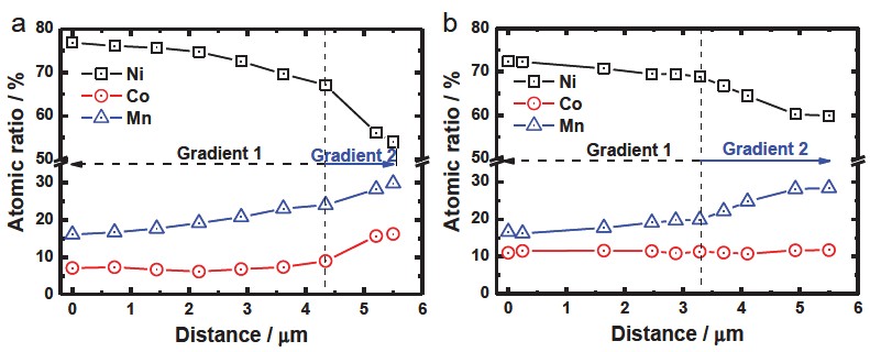 包覆改性是锂离子电池三元正极材料常用的改性方法之一,但由于合成过程的易出现包覆量过少(包覆不完全,改性不明显),包覆过量(惰性包覆材料增大阻抗),焙烧温度高(阳离子混排严重),焙烧温度低(包覆层结晶性差)等问题,出现了核壳结构。而核壳结构内核和外壳组分差异较大,经过反复脱嵌锂其体积变化差异较大,会出现核壳分离的不利现象。因此产生了浓度梯度的改性方法,该方法可以使内外组分完美的过渡,同时将贡献容量的Ni保护在内层,而稳定的Mn更多的在外层以获得更好的电化学性能。