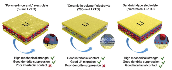 文中设计的三层式的复合电解质可以实现锂枝晶的抑制,同时可以实现室温下良好的界面联系。因此,可以视为是一种解决锂枝晶问题,并适用于室温下高能量密度电池的理想电解质。