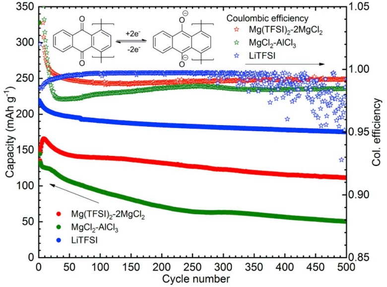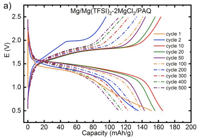 近日,Jan Bitenc 等人研究发现PAQ(聚蒽醌)可作为有效的有机物正极材料实现镁电池的可逆反应,题目为“Effect of salts on the electrochemical performance of Mg metal‒organic battery”发表在journal of power sources. PAQ基于离子配位反应的有机物与传统的反应原理不同,可避免Mg2+高价电荷密度的影响,随后通过研究PAQ在两种电解液(0.6M Mg(TFSI)2-2MgCl2 in DME,0.6M MgCl2-AlCl3 in DME)中的电化学性能,发现Al的引入提高了镁-有机物电池体系的工作电压,但加入Al后循环性能下降,对提升循环稳定性提出更高的要求。