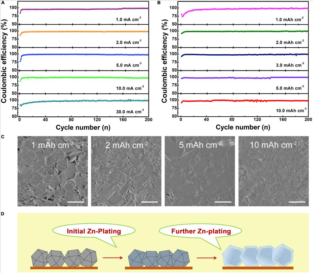 该材料应用于锌的超级电容器和锌离子电池,性能均有较好的提升。与具有常规纯Zn金属阳极的控制单元相比,这是一个巨大的进步。这些结果可能为开发用于水性电池的高度可逆的Zn金属阳极开辟新的低成本途径。
