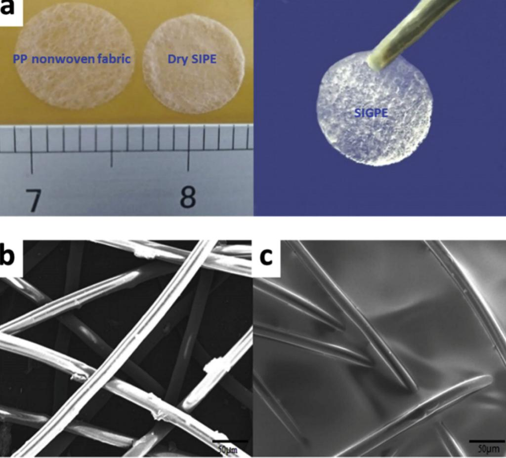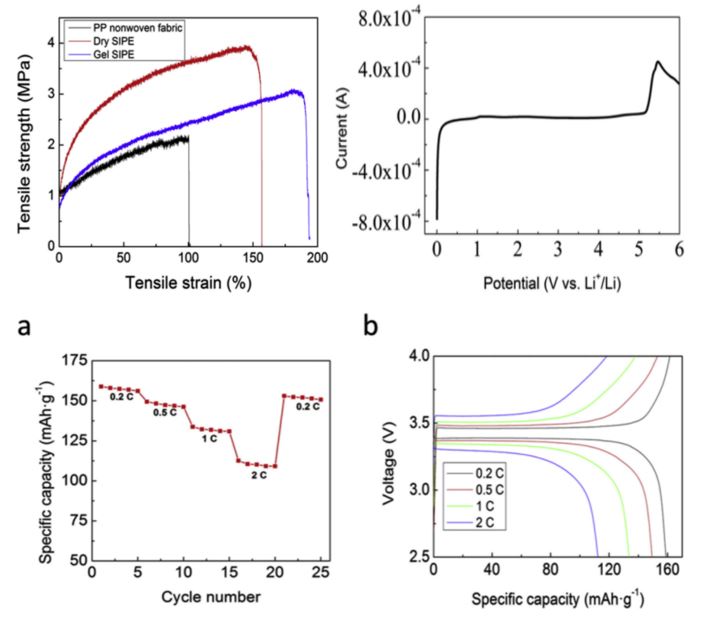 最近,中山大学的孟跃中教授在《Energy Storage Materials》上发表了以“Lithium (4-styrenesulfonyl) (triflfluoromethanesulfonyl) imide based single-ion polymer electrolyte with superior battery performance”为题的文章。文章通过简单、高效的紫外引发一步合成了用聚丙烯(PP)支撑的、具有交联网状结构的单离子传导的固态聚合物膜,在加入增塑剂后,膜具有良好的柔韧性、高的离子电导率、离子迁移数、电化学窗口、与锂负极良好的界面兼容性,并且在组装的LiFePO4/SIGPE/Li电池中展示了良好的倍率性能和循环性能。