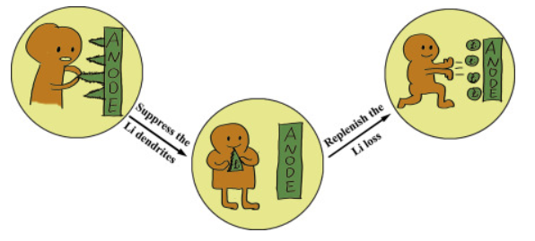 近日,出于开发一种在产业上可行的锂保护方法的考虑,同济大学伽龙、黄云辉课题组提出了一种具有实际应用可行性的“吃枝晶”策略,通过在商用化PP隔膜上引入非常薄的Si涂层(0.2 mg/cm-2)来调节Li+的电沉积并改善锂负极的循环性能。当Si层用于LMB中时,可通过与锂枝晶发生化学反应来避免电池短路。这样的反应还使得在锂表面上形成了富含硅化物的SEI。这种富含硅化物的SEI不仅可以防止锂与电解液之间的直接接触,而且还可以作为“有营养的”备用锂储库,以补充循环过程中的锂损失。这样的过程就像我们吃掉食物并将其转化为营养以提供能量一样(如摘要图所示)。使用这种“吃枝晶”的隔膜,锂负极的循环稳定性和可逆性得到了显着改善,从而在碳酸酯电解液中实现了的>1000 h的锂剥离/沉积寿命,并且库伦效率(CE)被提升到了> 97.6%。当将其与工业化用高面载量的LiFePO4正极(20.0 mg cm-2)结合使用时,可证明全电池循环稳定性显着得提高了。这种策略为在实际应用中使用高能量密度的锂金属电池提供了一条通用途径。该文章发表在国际顶级期刊Energy Storage Mater上。