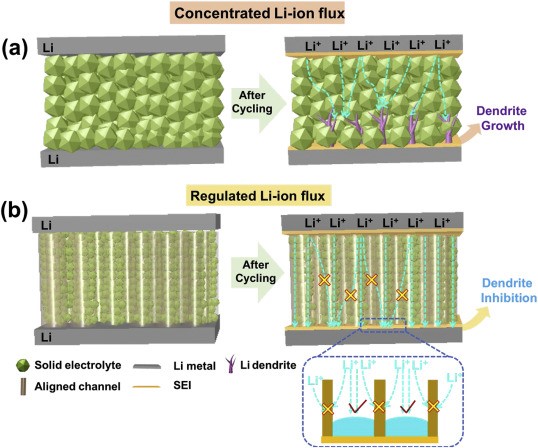 随着社会的发展,人们对安全和并且具有高能量密度的电池需求不断增加。锂金属因为具有较高的理论容量(3860mAh g-1)而被认为是锂电池负极材料的终极选择。然而,锂金属电池的发展一直受锂枝晶生成的限制。固态电解质由于其高安全性和高能量密度等优势受到了广泛的的关注,而且,固态电解质的机械韧性为抑制锂枝晶提供了有效的解决方案。在众多的固态电解质中,硫化物固态电解质由于其较高的室温离子导电率受到了特别的关注。然而,固态电解质仍然受到锂枝晶生成的困扰。最近研究表明,生成锂枝晶的其中一个重要原因是由于在锂金属表面的不均匀的锂沉积和剥离。因此,通过控制电解质的结构来促进均匀的锂成核和生长可以为抑制锂枝晶的生成提供有效的方法。近日, 美国路易斯维尔大学王慧课题组和东北大学祝红丽课题组等人利用硫化物液相合成法和定向排列的的木材结构,将硫化物电解质(Li6PS5Cl)灌注到木头垂直且方向一致的孔道结构中,制备了具有可调控锂离子传输的固态电解质结构(Li6PS5Cl@wood)。XRD和SEM证明了这种Li6PS5Cl@wood固态电解质的结构稳定性,并且在对称Li||Li6PS5Cl@wood||Li电池循环中实现了稳定并且长时间的电化学循环 (1000h) 而没有发生由于锂枝晶形成而导致的短路现象,最后由XPS进行界面分析。同时美国德克萨斯大学阿灵顿分校的曹晔课题组进行了相场模拟计算探究了该电解质结构抑制锂枝晶形成的机理。而且,该固态电解质结构实现了全电池Li|| Li6PS5Cl@wood || Li4Ti5O12(LTO)的稳定循环。该文章发表在国际顶级期刊Energy Storage Materials上。