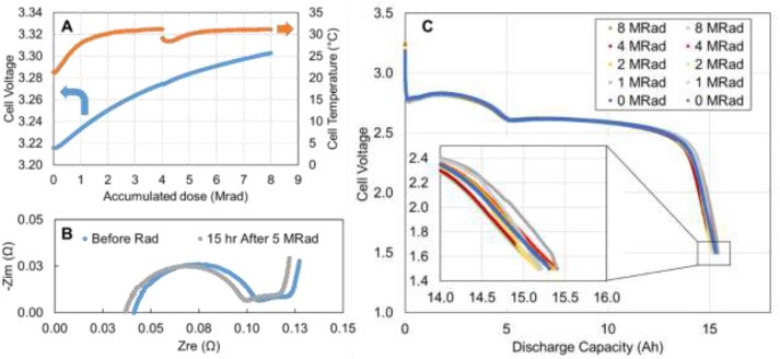 在现有的航天发射能力下,重量是所有航天器必须要面对的一个问题,对于航天器的储能装置而言,降低重量就意味着需要提升能量密度,因此航天器,特别是深空探测航天器对于高能量密度储能产品的需求十分迫切,因此在一些登陆小行星、彗星等探测任务中,具有更高能量密度的Li/CFx一次电池成为航天器的最佳选择。在探测地外行星时为了避免地球微生物对于地外行星环境的破坏,通常需要对航天器进行彻底的消毒,常规的高温杀菌会造成Li/CFx严重的容量衰降,因此伽马射线照射就成为了航天器消毒的理想选择。近日,美国喷气推进实验室的John-Paul Jones(第一作者,通讯作者)研究了大剂量的γ射线照射对于Li/CFx体系电池容量和性能的影响,研究表明经过照射后电池的容量和能量衰降小于2%,内阻略有增加,电池性能衰降的主要来自于界面副反应引起的界面膜变化,电解质体系中,相比LiBF4,采用LiClO4做为锂盐时能够获得在辐照条件下更为稳定的正负极界面膜,减少辐照对于电池性能的影响。