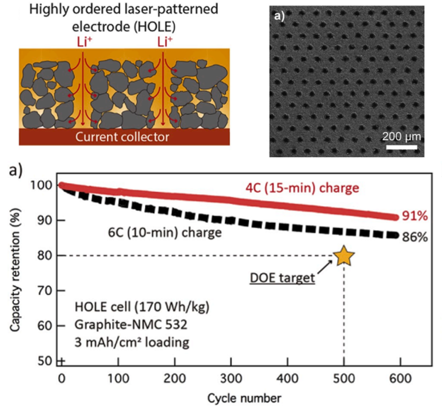近日,美国密歇根大学P. Dasgupta等人采用激光刻蚀技术在石墨负极表面制造了大量规则的直孔,帮助锂离子在厚电极中快速扩散,减少大电流充电工况下负极的极化,有效抑制了负极析锂,显著提升了电池的快充条件下的循环性能。在4C的快充倍率下,600次循环后电池的容量保持率为91%;在6C的快充倍率下,600次循环后电池的容量保持率可达86%。相关工作发表在知名期刊Journal of Power Sources。