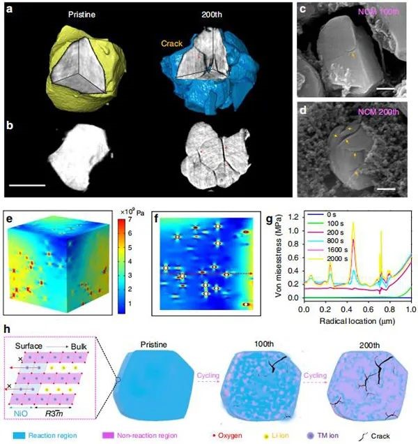 近日,哈尔滨工业大学王家钧教授,美国阿贡国家实验室陆俊研究员和中国科学院物理研究所苏东研究员(通讯作者)使用同步辐射X射线显微镜和X射线纳米断层照相术研究了单晶电池材料中的潜在衰退机制。由于具有超过220 mAh g-1的高比容量,他们选择了高镍单晶LiNi0.6Co0.2Mn0.2O2(NCM622)作为模型电极;而为了将结构/形态变化与循环性能联系起来,他们在单晶水平上可视化了长循环过程中的中尺度相分布。实验结果表明,这种在循环过程中从均匀性到非均质性的相变的物理特征,会诱导颗粒裂纹形成,并在单晶的结构稳定性中起主导作用。此外,作者发现采用表面调节方法可以缓解单晶NCM622中这种不良的相变并显著提高循环性能,进一步阐明了表面化学,相变和性能之间的关系,同时为合理设计高性能,稳定的分层正极材料提供了新的指导原则。相关研究成果发表在Nature Communication上。