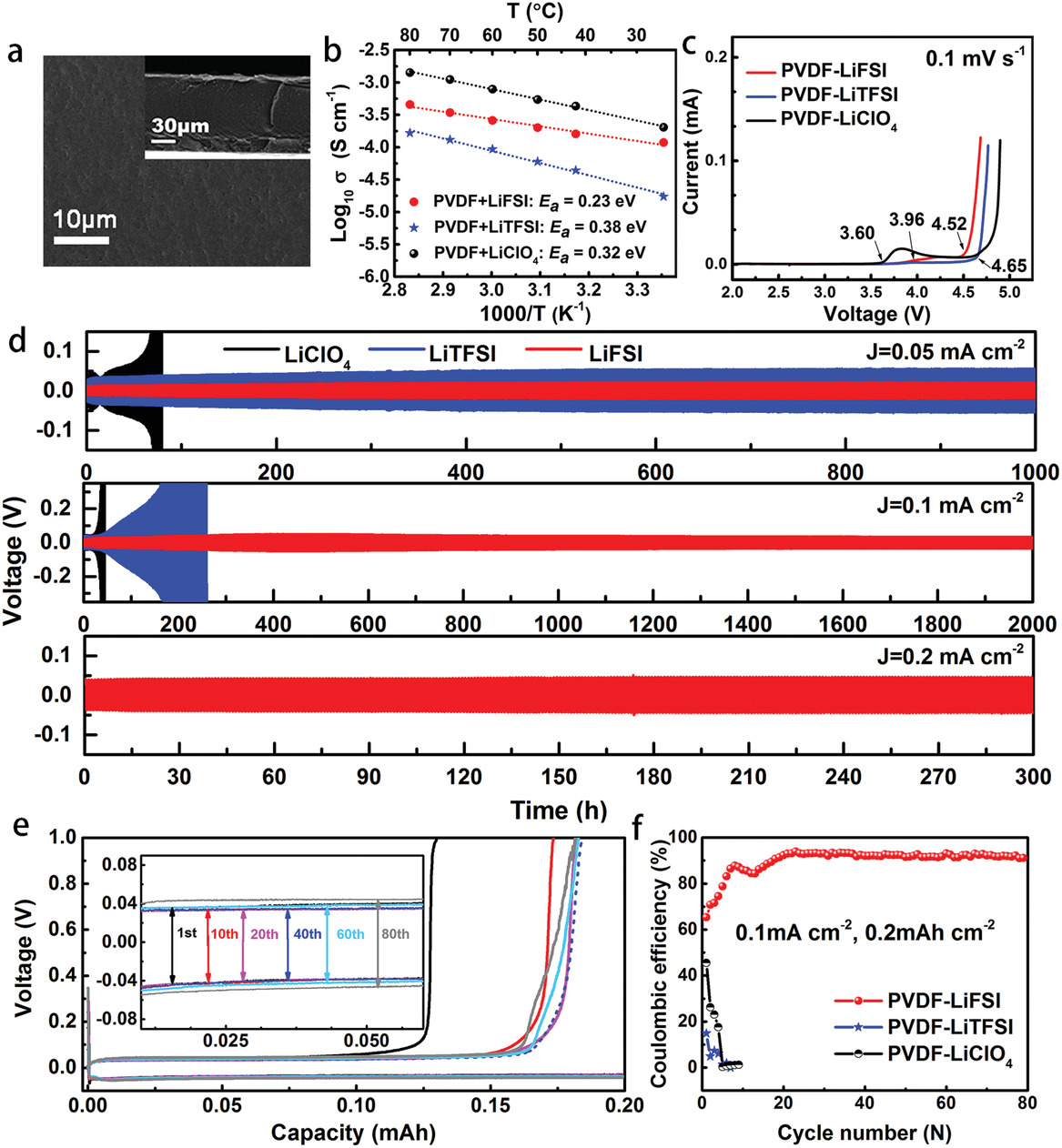 在该工作中,南策文院士声称使用简单的溶液浇铸法得到了一种使用LiFSI锂盐的PVDF基固态电解质,其电导率较高,且能形成多组分的纳米级界面层,有助于抑制锂枝晶,从而提高锂金属电池的循环稳定性。