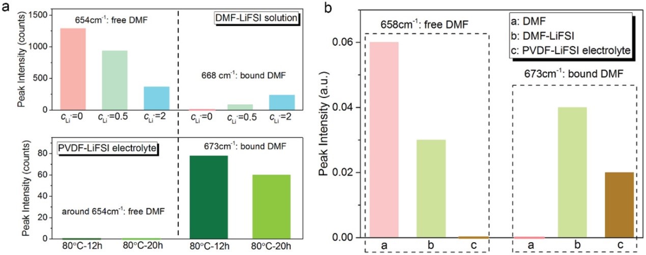 南策文院士则认为,相比于通常的凝胶电解质文献(增塑剂含量通常>50%),在自己的研究工作中,DMF的含量很低。通过拉曼光谱和红外光谱分析,电解质膜中残留的DMF并非是游离的,而是与锂离子络合的。与传统的凝胶电解质依赖游离溶剂导锂不同,在前文所述的PVDF基固态电解质里,传导的是DMF与锂离子络合形成的[Li(DMF)x]+,依赖聚合物链段进行离子传输。即便说少量残留的溶剂存在塑化效应,那也仅仅是可以增加PVDF基质中的非晶区来促进链段运动。