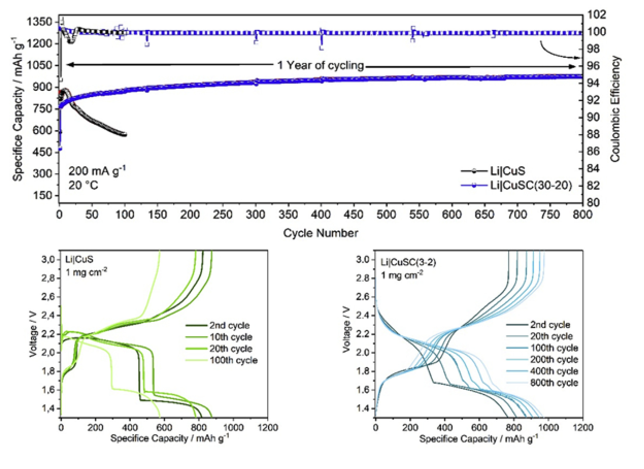 近日,德国亥姆霍兹研究所的Stefano Passerini教授(通讯作者)探究了CuS作为添加剂与S正极复合,提高Li-S固态电池的活性物质负载量。使用的固态电解质为经典的硫化物电解质LiI–Li3PS4,室温下电导率可达10-4 S/cm。研究了硫化铜-碳(CuSC)和三种不同的硫化铜-硫-碳(CuSS)复合材料作为正极。该复合材料是通过简便,低成本的机械化学球磨制备的。使用这样的复合电极在20°C下可提供高达1600 mAh g-1和7 mAh cm‑2的容量。这样少量的CuS添加剂可以很好的稳定Li-S固态电池的循环且能提高锂硫电池的体积容量,最高可达3900 mAh cm‑3(相较于传统的硫碳正极潜在的体积能量密度增加15%)。