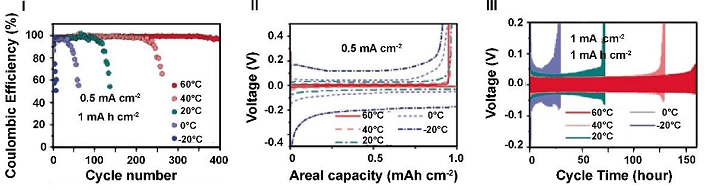 高温也会对锂枝晶的生长与SEI膜的形成产生巨大的影响。较高的温度会导致较低的过电势,从而形成较大的成核半径和较低的成核密度。20℃下基于醚基电解液形成的非晶态聚合物SEI层在液体电解质中具有高溶解性,导致其极易破碎而不能有效钝化负极,带来持续的副反应和循环的不稳定性。相反,60℃下形成的SEI层具有更厚、更稳定的多层结构,其机械强度足以有效钝化金属锂负极,从而增强循环稳定性。但是在无添加剂的碳酸酯基电解质体系下,温度同时也会影响反应动力学,较高的温度意味着电解质的加速分解以及厚且不均匀的SEI,引发阻抗和电流密度的分布不均匀和差的循环稳定性。但是低温也有一定的好处。20℃下测试的电池在前50圈循环中相比更低温度下的电池具有更低的过电势(归因于较低温度下增加的电荷转移阻抗);但是经过一定时间循环后,20℃下运行的电池表现出明显的过电势不均匀性,而在低温下运行的电池显示出更低且规律的过电势。