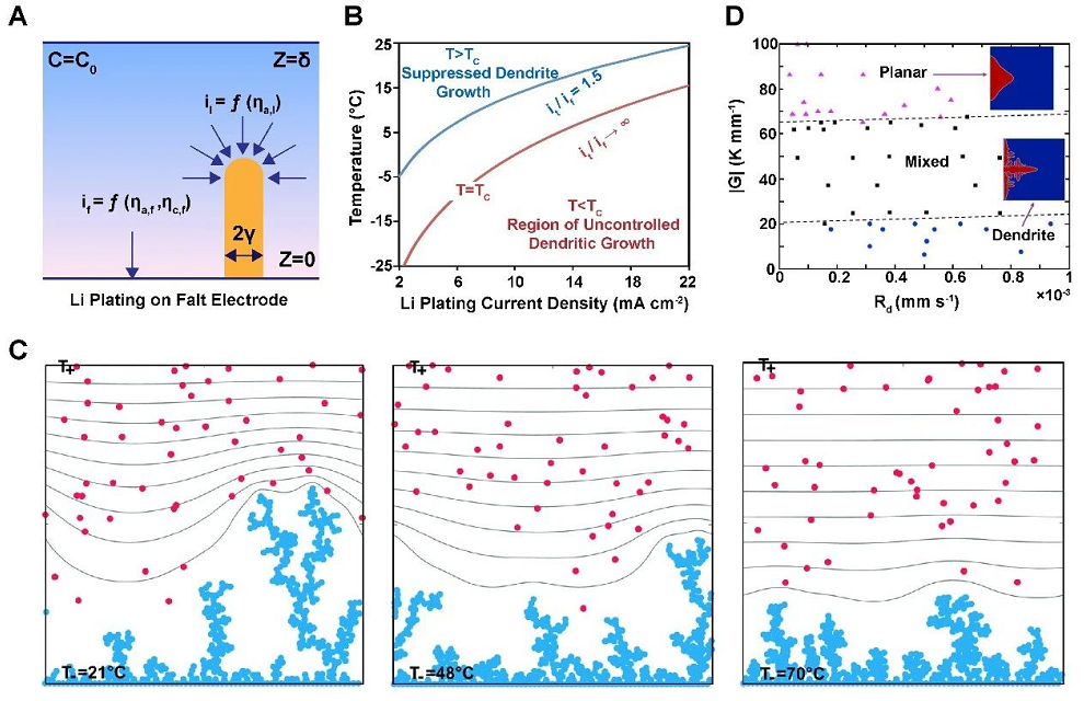 锂金属的生长是一个多物理场耦合的过程,受到锂离子扩散、温度、电场分布、电流密度分布等多种因素的影响。近日,John B. Goodenough课题组在Joule上发表了一篇关于锂金属负极枝晶生长热力学的综述,文章以温度和能量两者为例,重点介绍了锂枝晶有关热力学影响因素的最新研究进展,重点介绍了一些热力学模型及相关的实验证据,并提出了未来的研究方向。