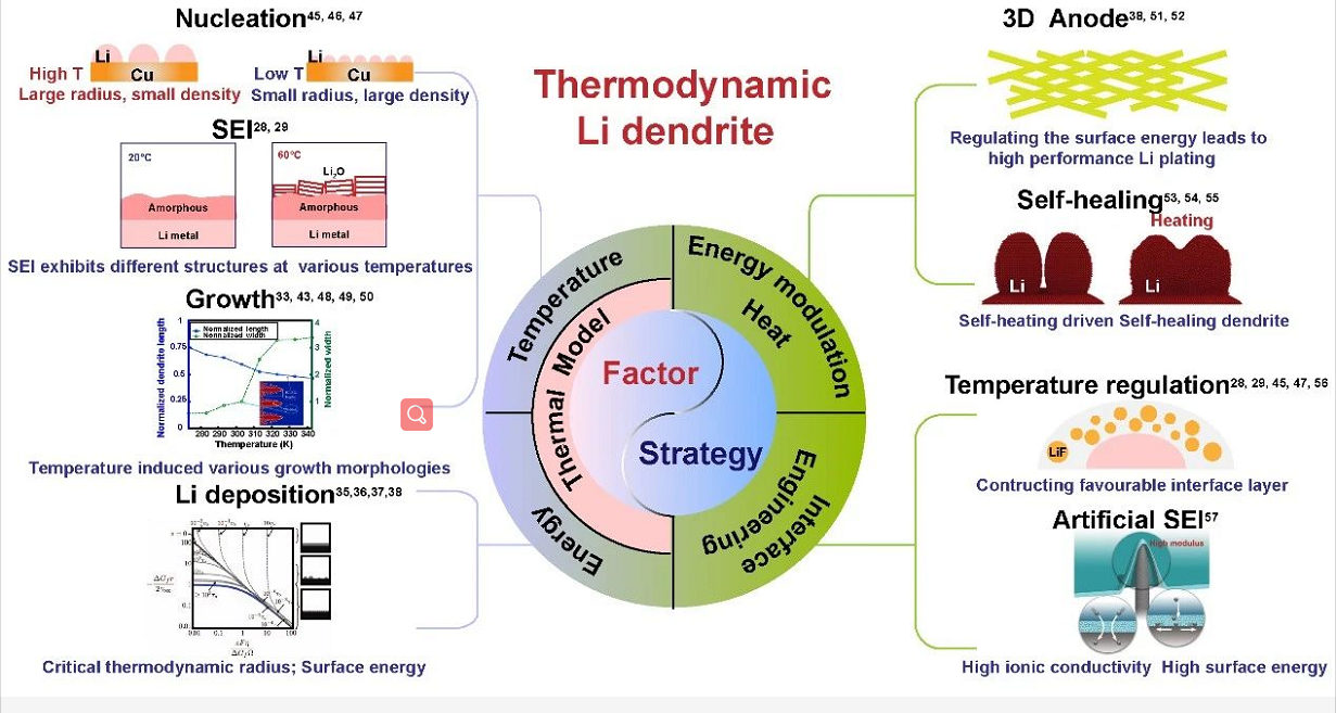 综上所述,本文提供了对锂枝晶形成的研究,通过包括温度和能量因素的热力学参数的考虑来构造无枝晶锂负极的相关问题和解决方案。基于热力学参数的未来研究方向应该包括: