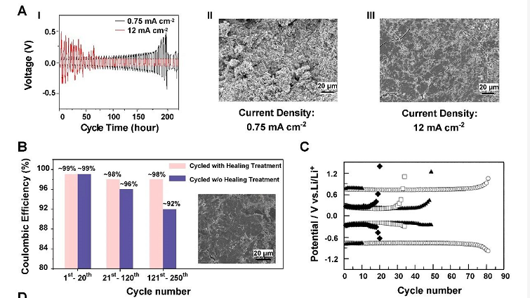 基于以上模型,研究者们也提出了一些锂金属负极的改性策略。Koratkar提出了高电流密度下控制电化学沉积的枝晶自愈合策略。高电流密度引起电化学过电势增加,导致了成核半径变小、成核速率加快、成核密度增加。因此,经过枝晶的电流能产生足够的焦耳热来促进锂原子从枝晶尖端迁移到相邻枝晶间的凹谷区域,广泛的扩散从而使枝晶光滑。而且用正常的电流密度循环,同时伴随反复的高电流密度愈合处理的电池同样表现出更好的循环性能和高库伦效率,以及低热失控风险。温度是决定电解质和SEI的性质的重要因素,因此控制温度可以改变电极/电解质的界面性质。Ishikawa等人在LiPF6–PC/DMC电解液中,于- 20℃下在镍基底上预循环锂金属,在25℃下实现了稳定的低电阻LiF界面层,从而提升了锂负极的循环性能。Wang等人则通过将温度提升到60℃,在醚类电解液中实现了相比室温(20℃)更好的电化学效应。如上所述,高温下(60℃)沉积的低表面积锂颗粒减少了锂与电解质之间的接触,降低了副反应的发生。在60℃下,醚基电解质中形成的SEI表现出机械稳固且有序的多层结构,从而有效钝化负极,实现较少的不可逆锂损失和较高的库伦效率。