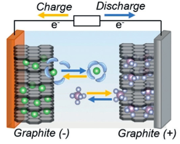 传统锂离子在充放电时伴随着锂离子的去溶剂化过程,研究表明该步骤有可能是低温条件下的决速步骤,会极大地影响低温性能。针对这一问题,美国加州大学圣迭戈分校陈政课题组设计了双离子电池。该电池在充电时阴离子嵌入正极,锂离子嵌入负极,而在放电时则是阴离子从正极脱出,阳离子从负极脱出,这样可以实现在低温放电时规避锂离子的脱溶剂化,从而实现低温放电性能的提升。