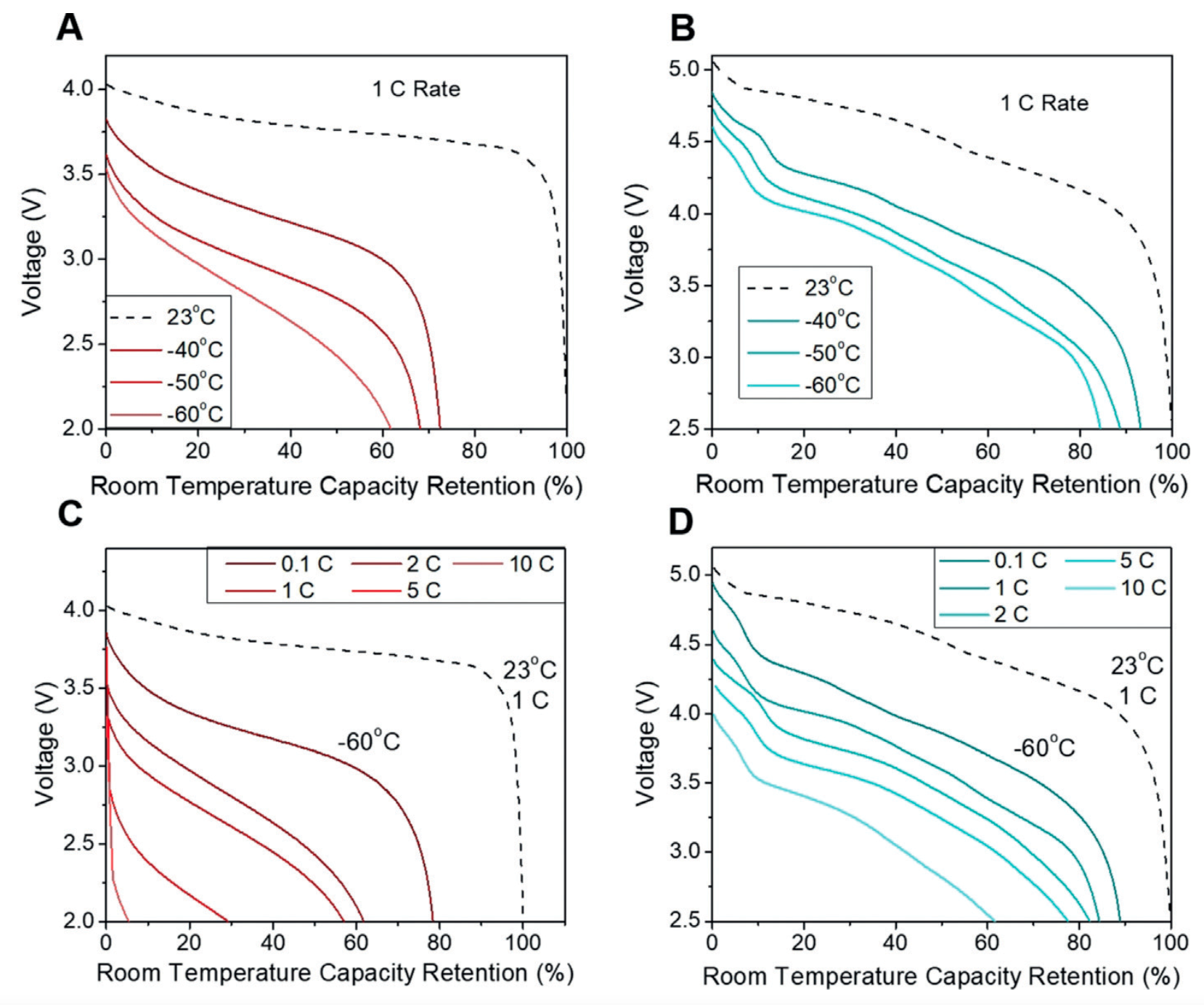 图2. 1C倍率下,(a)LCO/石墨电池不同温度下放电性能(b)石墨/石墨电池不同温度下放电性能; -60度下,(c)LCO/石墨电池不同倍率下放电性能(d)石墨/石墨电池不同倍率下放电性能