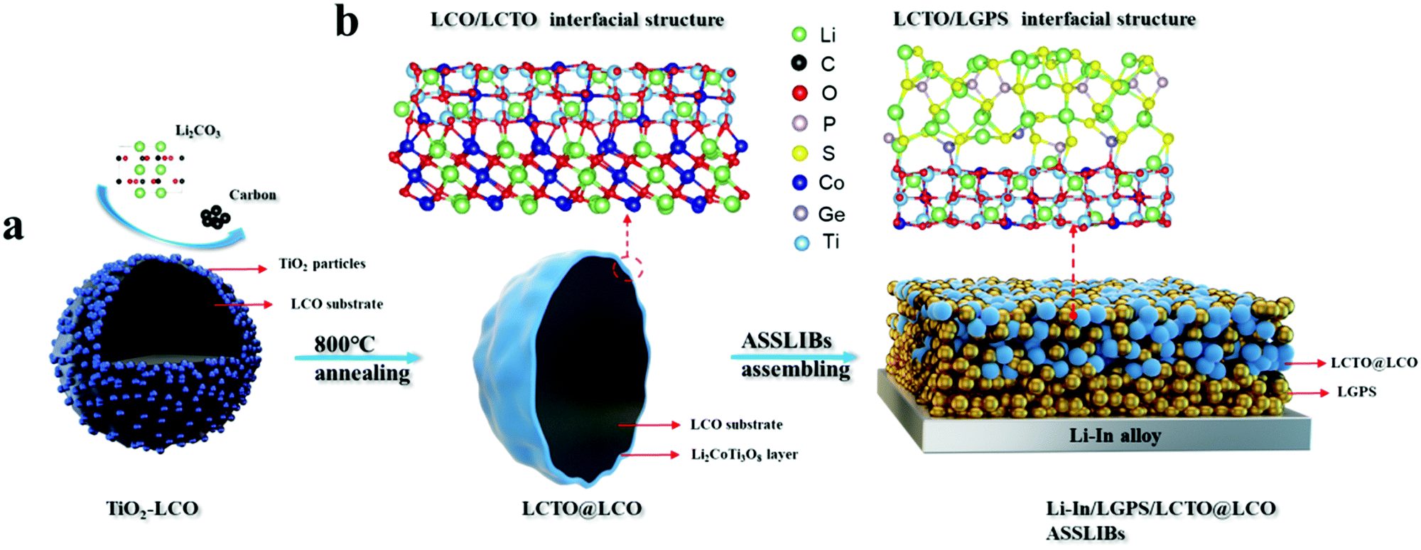 该文章的主要内容是利用TiO2和LiCoO2在LiCO3和乙炔黑添加剂作用下高温退火反应生成超薄的正极缓冲层LCTO(Li2CoTi3O8),其厚度约为0.5 nm,超薄的LCTO连续包覆在LCO正极上。研究表明LCTO本身电子电导率为2.5*10-8 s/cm),锂离子迁移数为DLi+=8.22*10-7 cm2/s),且具良好电池性能,在组装成液态电池时倍率性能很好。LCO@LCTO正极和LGPS组装的电池0.1C室温下首圈容量140 mA h/g,200圈后保持为116 mA h/g。表现出好的性能,在使用更高截止电压时也能保持较好的倍率性能。