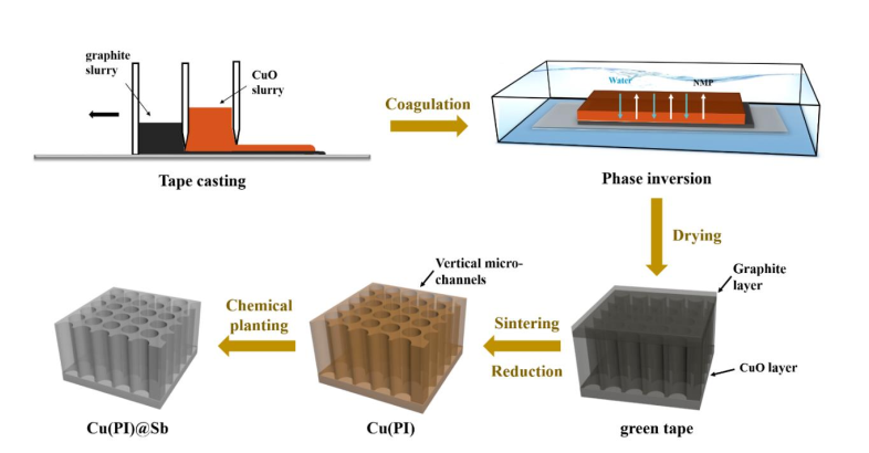 尽管使用金属锂作为阳极高能量密度电池能实现更高的能量密度 ,但是短寿命和巨大的体积变化造成的严重的安全风险的锂电极在电镀/剥离和锂枝晶的无法控制的增长是两个锂金属阳极的主要问题。中国科学技术大学的陈春华教授课题组通过相反转铸造法,制备了一种具有垂直微通道孔结构的新型三维铜集流体,之后在其表面包覆了亲锂的锑界面相。引入的亲锂界面能显著降低锂成核障碍,抑制锂枝晶的形成。垂直微通道的孔隙结构可以有效降低局部电流密度,调节Li的平稳沉积。因此,采用混合结构衬底的对称电池在12 mAh cm−2和12 mA cm−2条件下,寿命超过2000小时。