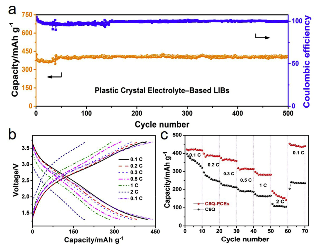 该准固态电池初始容量可以达到425mAg-1,在0.1C下,500个充放电循环后仍具有405mAg-1的容量,并且具有良好的倍率性能。
