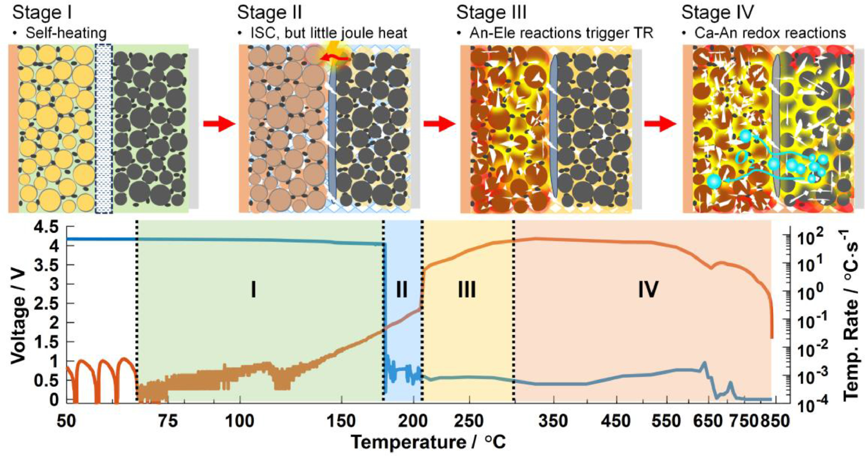 热失控一直是一个放热化学反应和内部短路重合、相互作用的热电耦合过程,是阻碍锂离子电池应用的关键问题。弄清化学反应和内部短路对热失控的贡献对于开发更安全的锂离子电池至关重要。