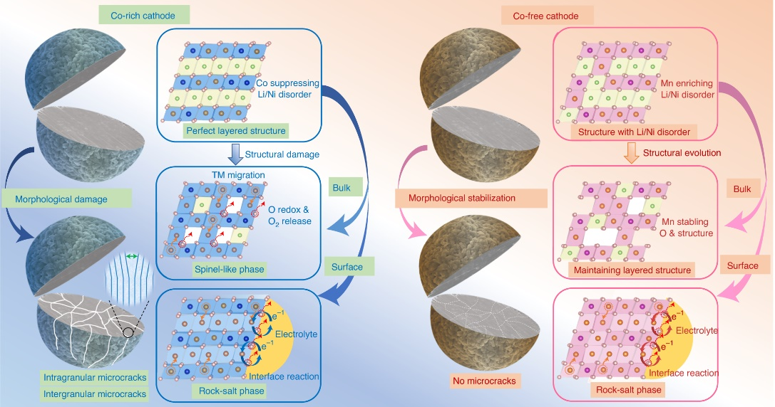 图.富钴材料和无钴材料在高电压循环过程中结构和形貌演变