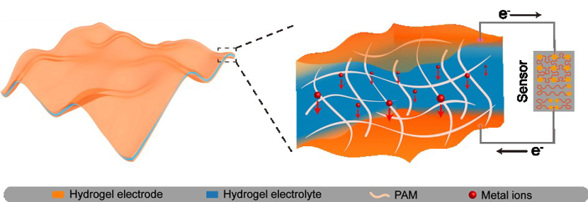 图 1. 全水凝胶电池的结构和工作机理示意图。