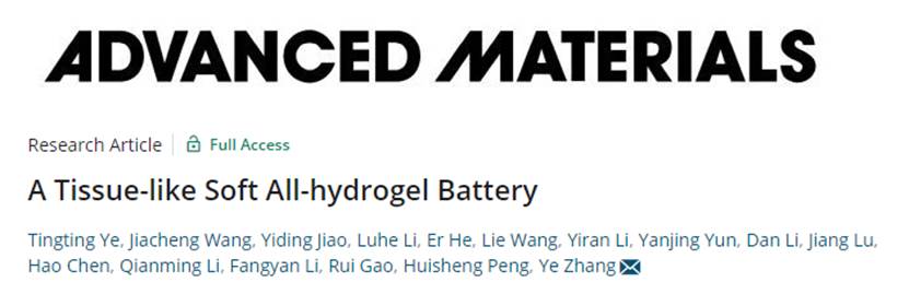 南京大学张晔副教授首次报道了全水凝胶设计组织状软电池(图 1)。通过利用界面干交联策略,获得了具有优异导电性和高界面电荷转移效率的集成电池配置。该策略代表了实现具有高电化学性能的超软电池的通用且有效的方法。例如,在0.5 A·g-1的电流密度下,全水凝胶锂离子电池的比容量为82 mAh·g-1,全水凝胶锌离子电池的比容量为370 mAh·g-1。同时,超软电池表现出80 kPa的杨氏模量,与生物组织的力学性能完美匹配。全水凝胶电池的高稳定性和生物相容性已在可穿戴和植入式应用中得到证明。相关成果以题为“A tissue-like soft all-hydrogel battery”发表在国际著名期刊《Advanced Materials》上。