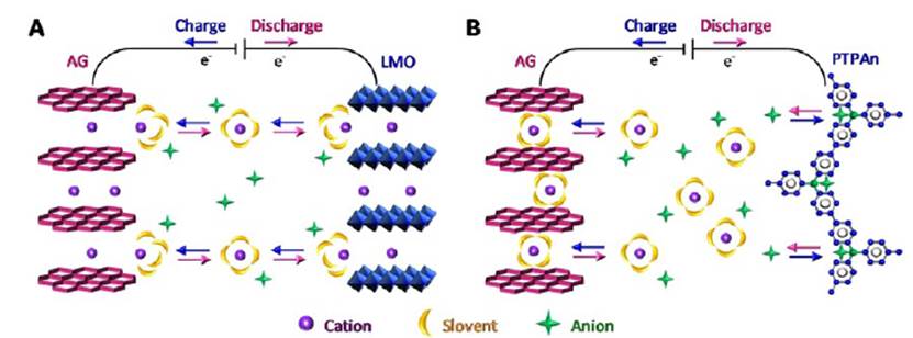 图A:传统摇椅电池(LMO||AG)示意图;图B:钠双离子电池(PTPAn||AG)示意图