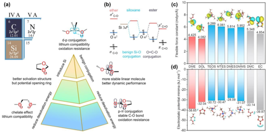 图1 分子设计原则。(a)1,2-二甲氧基乙烷(DME)和碳酸乙烯酯(EC)分别是醚类和酯类溶剂的典型代表。 (b), 醚、硅氧烷和酯的近似分子轨道的示意图。其中硅氧烷和酯具有共轭效应。(c), 8种溶剂中指定的C-O和Si-O键的计算弹性力常数(虚线标记)。(d), 8种溶剂的计算静电势最小值。