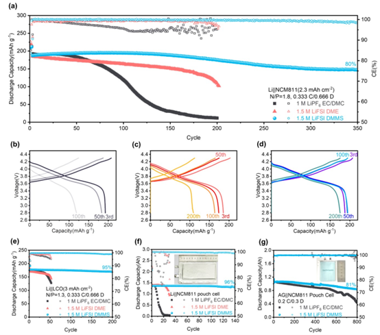 (a)Li/NCM811全电池循环图 (b) 碳酸酯电解液 (c) 醚类电解液 (d) DMMS电解液 (e) Li/LCO 全电池 (f) Li/NCM811软包电池 (g)NCM811/石墨全电池