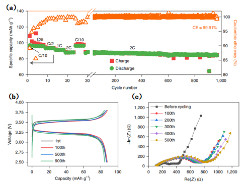 进一步,基于EO10-PFPE的固态钠金属电池Na3V2(PO4)3/Na在80℃、2C(高倍率)下经过900次循环,容量保持率为97.5%,平均库伦效率为99.91%。