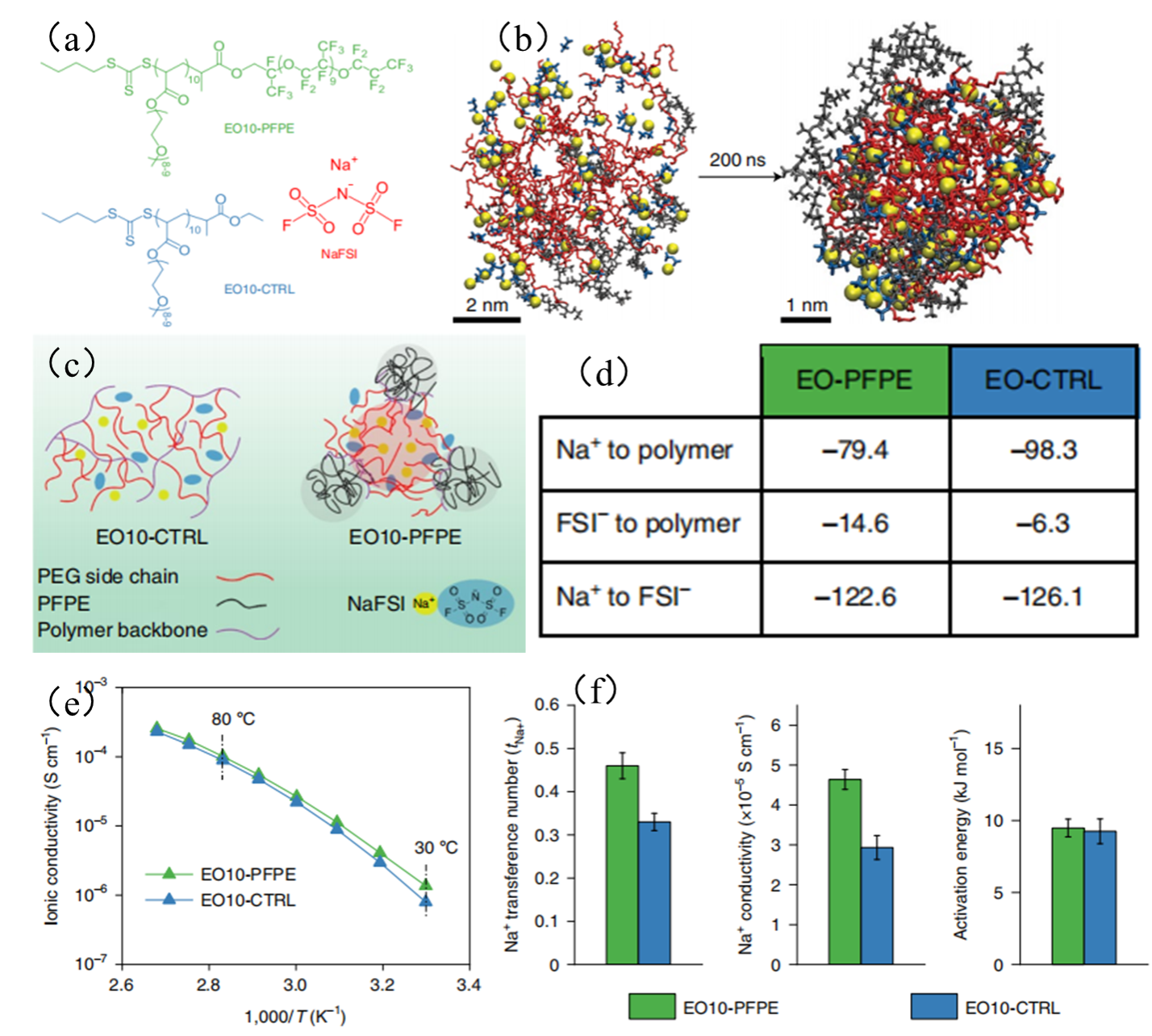 (a)聚合物设计原则。(b)分子动力学模拟结果。(c)EO10-PFPE与EO10-CTRL微观机构示意图。(d)不同组分间的结合能。(e)不同电解质的电导率。(f)不同电解质的电导率与钠离子迁移数、钠离子电导率。