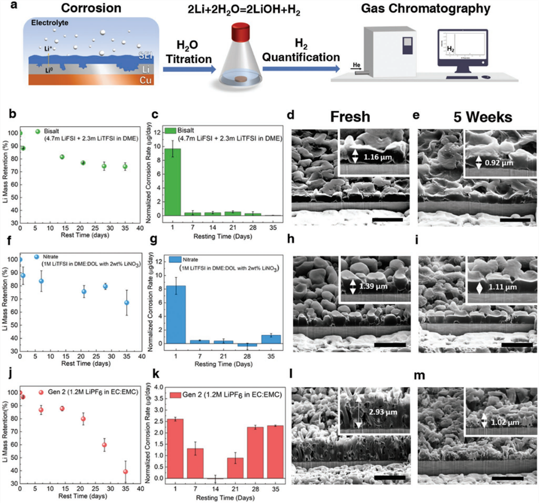 作者采用研究手段主要是利用滴定气相色谱法(TGC)来评估液态电解质中金属锂的化学稳定性,通过滴定将腐蚀之后剩下的活性锂的量定量出来来确定被腐蚀的锂的量,对这四种电解质体系中沉积锂的腐蚀趋势进行量化。
