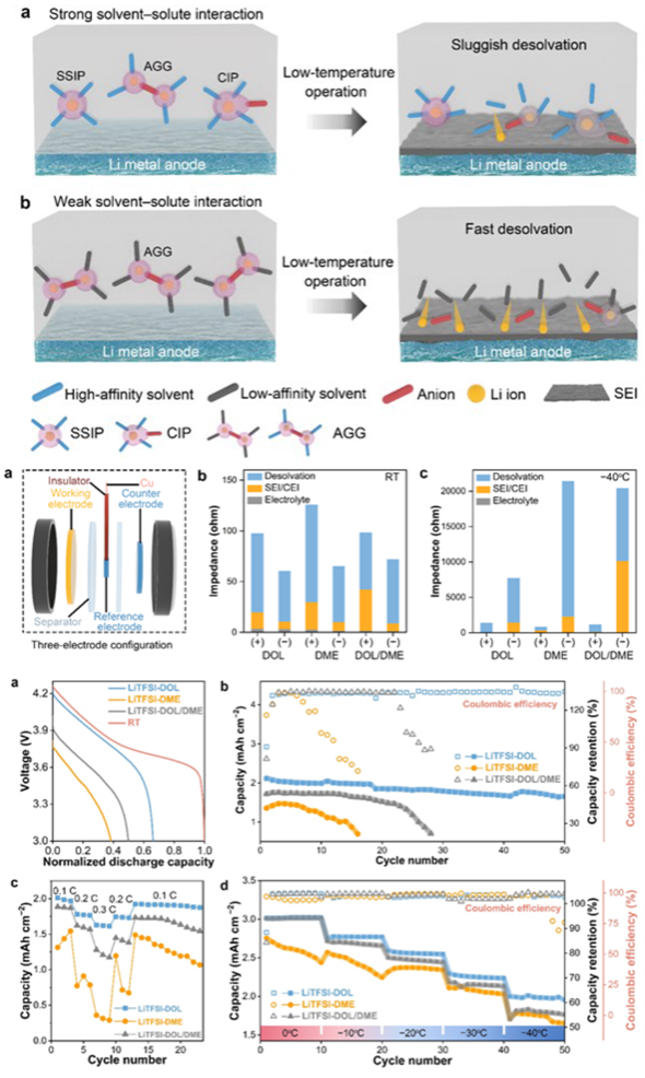锂金属电池有望实现超过400Wh/kg的能量密度,但在极端低温(-30℃以下)使用时,其放电容量和电压平台明显下降,这主要是由于界面过程的动力学势垒在低温下明显增加导致。在充电过程中,Li+先后经历以下几个过程:(1)溶剂化的Li+在电解液体相扩散;(2)溶剂化的Li+在界面去溶剂化(主要是脱去溶剂分子);(3)“裸”Li+穿过SEI层。为实现优异的低温性能,要求电解液具有宽液程、高离子电导率;低Li+溶剂化能;低SEI阻抗。