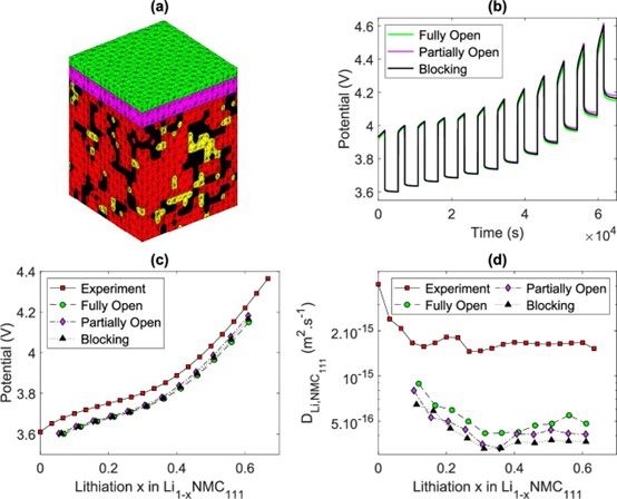 深入分析三种不同的CBD物理假设下活性颗粒的锂离子浓度分布,得出以下结论:锂离子在固相浓度不均匀分布,尤其是在更大、更孤立的NMC颗粒中。此外,在部分开放CBD和阻塞CBD的情况下,在CBD相附近的区域中,活性颗粒的Li+浓度增加。在这两种情况下,CBD可防止固相与电解质的界面锂脱嵌。这反过来会在活性颗粒中产生异质的Li+浓度梯度,从而影响固相扩散系数的分布。因此,CBD的阻塞性质越高,锂传输限制越高,而扩散系数越低。