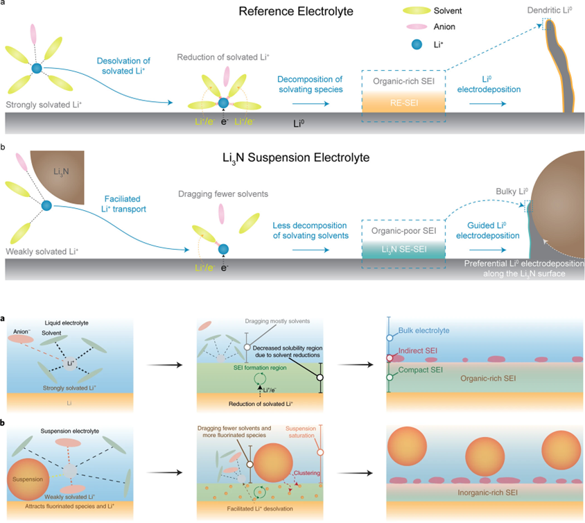 通过对Li3N和Li2O悬浮电解质理论和实验分析,阐明了Li3N和Li2O在锂阳极的液体电解质和固体电解质界面中所起的作用。① 无机悬浮颗粒的加入改变Li+溶剂化结构;②无机悬浮颗粒的加入可以诱导锂沿颗粒沉积;③无机悬浮颗粒的加入可以降低Li+-溶剂配位作用,形成弱溶剂化环境,促进Li+传输,并诱导贫有机SEI的形成;④无机悬浮颗粒可以通过和电解液中某些组分的相互作用,改善SEI组成;⑤无机悬浮颗粒悬浮电解液可以显著改善锂沉积行为,提高电池性能。通过悬浮电解液的设计,应用于传统和最先进高性能电解质,以证明其适用性。基于电化学分析,使用悬浮电解液,实现了提高库仑效率(高达~99.7%)、降低了Li成核过电势、稳定Li中间相和延长无阳极电池的循环寿命(~70次循环,初始容量的80%)。这一设计原则和发现,能够扩展到开发锂金属电池的电解质和固体电解质界面。