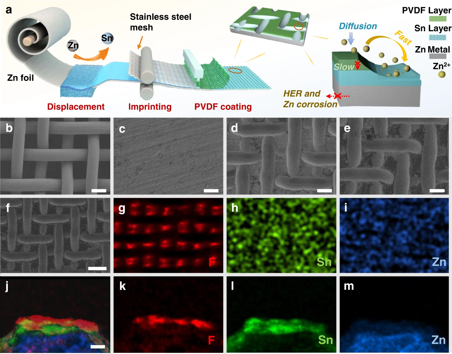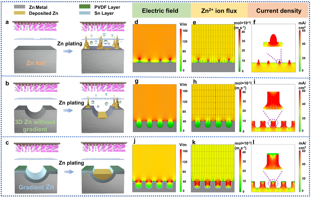 该工作利用简单的压印技术制备了导电性和亲水性梯度分布的锌负极,锌负极中微孔道的上表面是一层绝缘疏水性的PVDF,底部是一层导电亲水性的Sn,梯度导电性诱导电场、锌离子流和局部电流密度从低端向上呈梯度分布,使得锌金属实现从下而上均匀沉积。