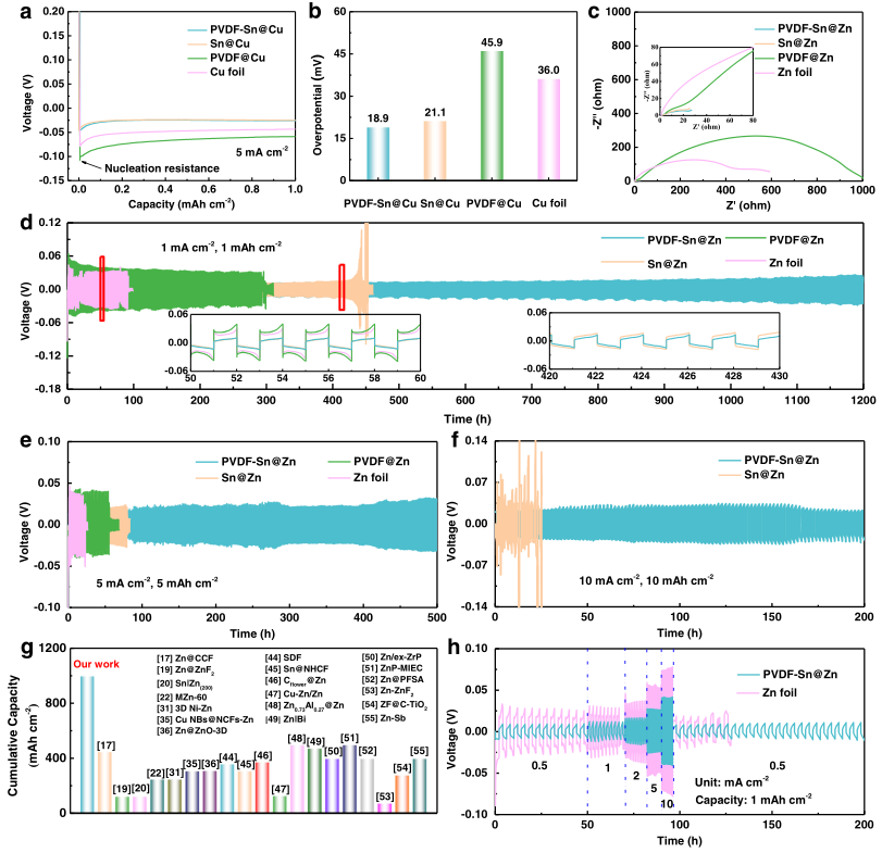 在电流密度/容量为1 mA cm−2/1 mAh cm−2的条件下,PVDF-Sn@Zn//PVDF-Sn@Zn电池具有较小的滞回电压(前600个周期小于15 mV)且稳定运行超过1200 h。而Zn箔//Zn箔、PVDF@Zn//PVDF@Zn和Sn@Zn//Sn@Zn的电池分别在92、294和445 h后发生短路。PVDF-Sn@Zn//PVDF-Sn@Zn可在5mA cm−2/5mAh cm−2的高电流密度/容量下稳定循环500 h。在10mA cm−2/10mAh cm−2的更高电流密度/容量下,PVDF-Sn@Zn//PVDF-Sn@Zn电池仍然稳定工作超过200 h。PVDF-Sn@Zn//PVDF-Sn@Zn电池在0.5至10 mA cm−2的宽电流密度范围内也具有优异的倍率性能。PVDF-Sn@Zn梯度电极的循环性能优于其他三种对照样品,原因在于通过梯度设计优化了电流密度和Zn2+离子浓度分布。