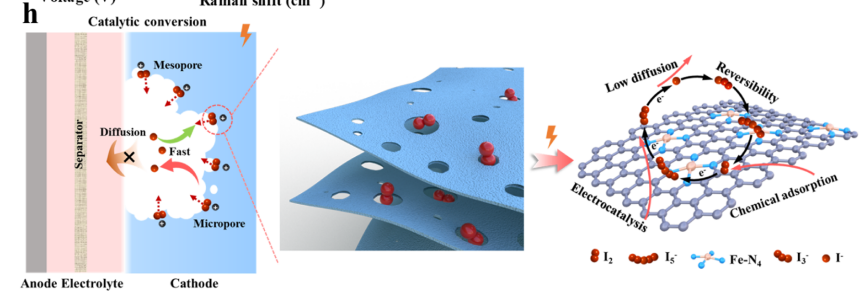 近期,山东大学的张进涛教授团队采用一锅法成功制备Fe单原子分散的环状N掺杂多孔碳材料(B-Fe-NC)。该工作在多孔碳中嵌入Fe单原子,形成Fe-N-C原子桥结构来调节多孔碳的电子结构,不仅增强碳材料空间限域效应,而且可以催化碘的氧化还原,使得锌-碘电池获得大容量和良好循环稳定性。这项工作表明,可以通过在多孔碳基质中用N合理锚定金属单原子来增强碘的氧化还原活性,对开发高性能锌-碘电池具有重要指导意义。
