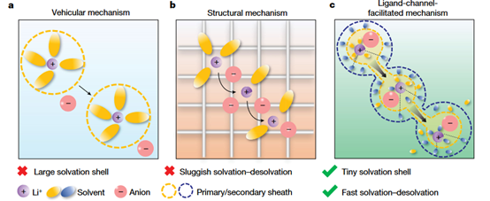 为了能让锂离子电池同时满足高能量密度、快速充电和宽工作温度的要求,电解液需要同时满足高离子电导率、低溶剂化能和低熔点,并形成阴离子衍生的无机界面。本工作中作者筛选出低溶剂化能的小尺寸溶剂(氟代乙腈FAN)作为单一溶剂,将1.3 M锂双(氟磺酰基)酰亚胺(LiFSI)溶解在FAN中制备成电解液,其在宽温范围内都表现出超高离子电导率。作者通过研究分子尺度的溶剂化动力学和飞秒二维红外光谱验证该电解液的离子传输机理为配体通道传输机理,即锂离子不断在溶剂和阴离子的相邻配位点之间跳跃。锂离子周围的次级溶剂鞘中的FAN将初级溶剂化鞘中的锂离子拉出,形成快速离子传输配体通道,同时也允许阴离子进入初级溶剂鞘,形成富无机界面。这与一般的稀电解液中的锂离子被溶剂化鞘携带运输,配位时间长的载体机制和高浓度电解液中的结构化机制不同。此外作者还提出TI传输指数来量化锂传输行为,TI约为0.5时可实现最大离子电导率,符合配体通道传输机制。使用该电解液的4.5 V石墨||NCM811软包电池即使在-65℃工作也能实现良好的循环可逆性。