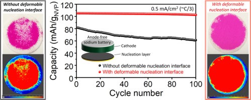 最近的研究为钠离子电池提供了一种一种改进无阳极钠金属电池(AFNMBs)性能的新方法。该方法通过在阳极集流体下方引入一种可机械变形的碱金属锂(Li)金属层,实现了钠金属的稳定成核和生长,减轻了固体电解质界面(SEI)或死钠的形成。实验表明,采用这种软锂金属界面的钠半电池在0.5 mA/cm²的电流密度下能够实现超过500个循环的99.98%稳定库仑效率(CE)。使用Na3V2(PO4)3作为阴极材料的全电池在C/10的电流密度下仅有5.4%的首次循环形成损失,并在0.5 mA cm-2的电流密度下经过100个循环后保持97.4%的容量,平均往返能量效率达到99.97%,这是迄今为止报道的零过剩AFNMB的最高CE和循环稳定性。